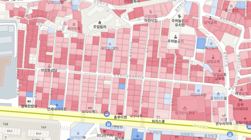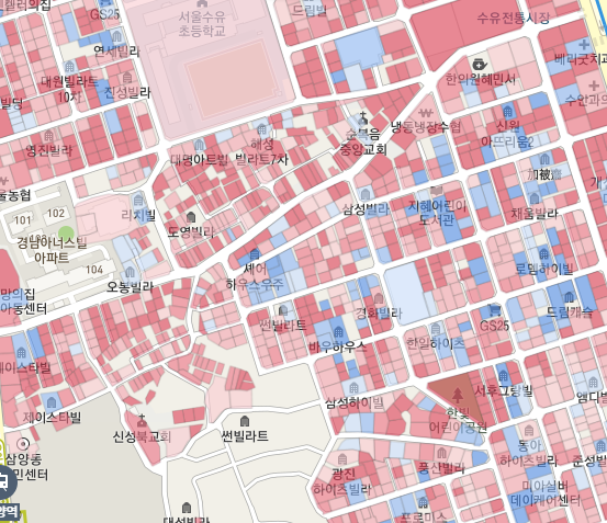붉은색이 진할수록 노후도가 심하다는 것을 의미한다. 미아11구역은 전체적으로 붉은색이 많다.