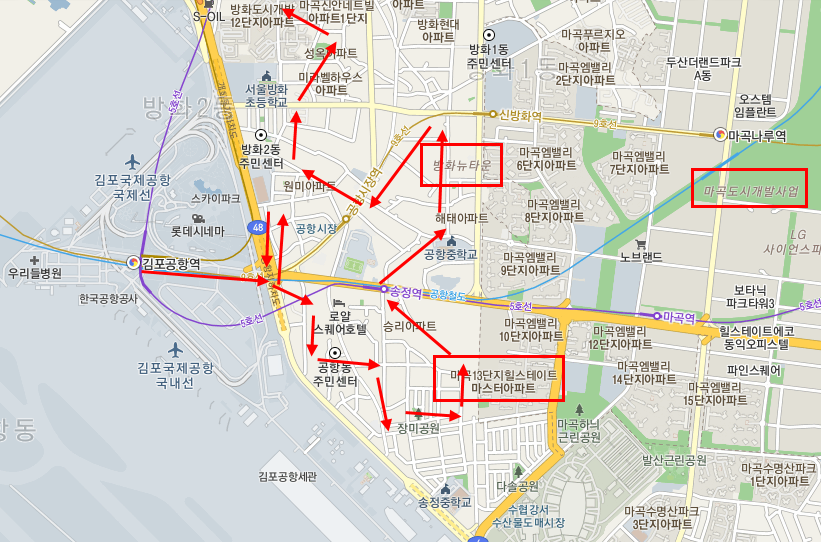 김포공항역에서 내려서 그 주변의 경매 물건들을 먼저 둘러봤다. 김포공항 우측부터 송정역 남측 공항동까지 돌아다니다가 다시 송정역 북측으로 방화뉴타운으로 갔다.