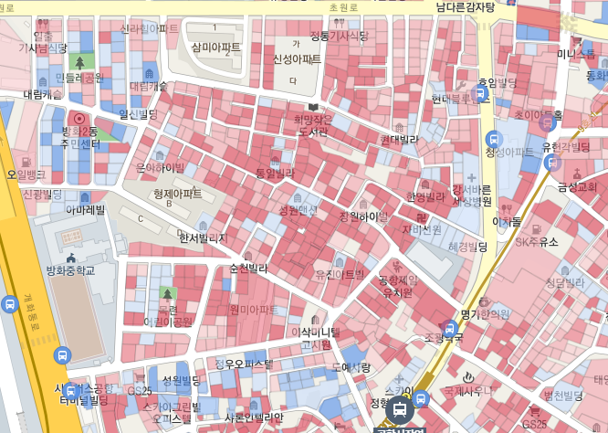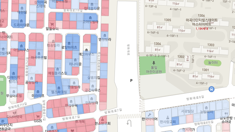 방화뉴타운은 전체적으로 노후된 상태이다. 중간 중간에 신축이 들어서긴 했지만 전반적으로 붉다.