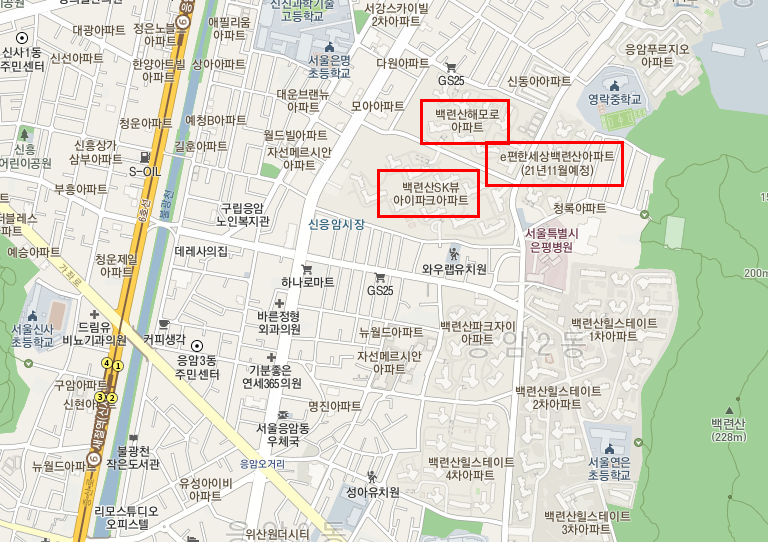e편한세상백련산아파트 우측으로 재개발 구역에서 제외된 곳이 있다. 그쪽에서 경매 물건이 간혹 나오는데 어떤 곳인지 궁금했다. 그래서 응암동으로 갔던 것이다. 그 주변으로 백련산SK뷰아이파크아파트, 백련산해모로아파트가 인상적이었다. 경매 물건들을 중심으로 6호선 라인에서 오른쪽으로 좀 떨어진 곳을 집중적으로 봤기에 응암역 주변에 나홀로 아파트들이 많은지 몰랐는데, 지금 지도를 보니까 응암역 주변을오 소규모 아파트들이 많이 있다.