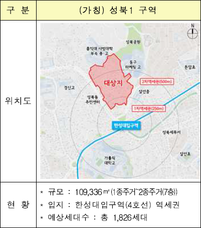 과거의 성북1구역에서 대로변에 접한 상가들 등 일부가 제외된 것처럼 보인다. 아무튼 성북1구역의 입지는 좋아 보인다. 위 현황에도 입지에 한성대입구역 역세권이라고 적혀있다. 단지 내 위치에 따라 역에서 거리가 차이나겠지만 가장 가까운 곳은 3분도 안 걸릴 것이다.