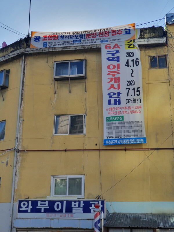 덕소역 2번 출구로 나가서 조금 걸어가니까 바로 재개발 관련 현수막이 보였다. 덕소6A구역 이주개시 안내 현수막이 보였다. 당시에도 기간이 한참 지난 상태였는데, 현시점에서는 1년 전이다. 이런 모습을 보면 재개발이 쉽지 않다는 것을 느낀다. 2020년 7월에 예정대로 이주가 끝났다면 바로 철거에 들어갔을 것이고 지금은 착공하지 않았을까. 지금은 어떤 모습일까.
