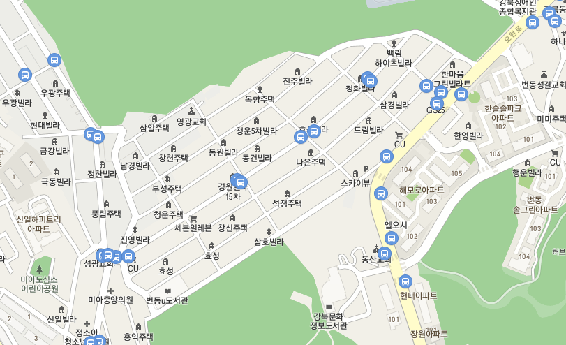 그리고 표시하는 것을 깜빡했는데, 빨간색 원 오른쪽 아래쪽으로 남경빌라 근처에 파란색 삼각형이 있습니다. 거기가 '노을집'이라는 번동 협소주택이 생긴 곳입니다.