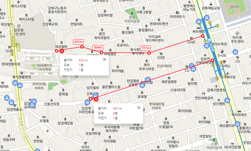 다시 아까 GS25가 있었던 상가주택 건물로 돌아가서 큰 도로 주변을 둘러보려고 했다가 다시 발걸음을 돌려서 미아역으로 갔습니다. 이쪽에서 미아역까지 직선거리로 500미터도 안 되었기 때문에 직접 걸어보고 싶었습니다.