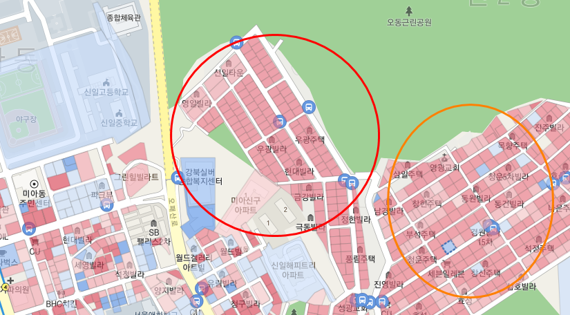 빨간색 원으로 표시한 곳이 미아동 258번지 일대 중 위쪽 부분입니다. 위 그림과 같이 신축 건물이 하나도 안 들어온 곳입니다. 이런 모습을 보고 여기가 미아258 재개발 구역인지도 모르고 그냥 관심을 갖고 다녀온 것이었습니다. 주황색 원으로 표시한 부분은 번동148 재개발 구역인데, 미아258 재개발 구역과 달리 신축 건물이 몇 개 들어왔습니다.