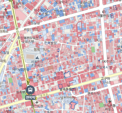 면목동의 노후도를 나타낸 것인데, 전체적으로 붉지만 신축도 상당히 들어온 것으로 보입니다. 동원전통시장을 지나가면서 철거가 이루어진 큰 필지를 봤는데, 위 지도에도 나옵니다. 동원전통종합시장이라는 글자가 있는 곳 바로 오른쪽에 점선으로 표시되어 있습니다.
