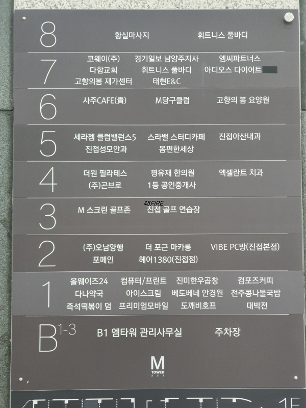 남양주에 있는 부동산에 가면 엠타워 옆에 진접역이 생긴다고 설명을 해주는데, 여기가 바로 그 엠타워이다. 앞에 올린 사진은 약간 옆면이고 여기가 정면이다. 피씨방, 스크린골프, 당구장, 휘트니스 등이 보인다. 여기에 다 있으니 단우타워에 공실이 생길 수 밖에 없다. 지금 사진을 자세히 보니까 엠타워 2층도 일부 공실처럼 보인다.