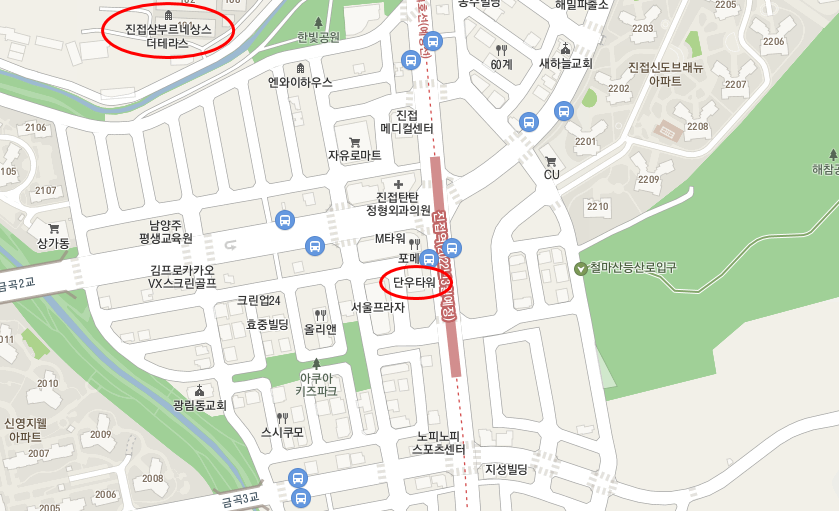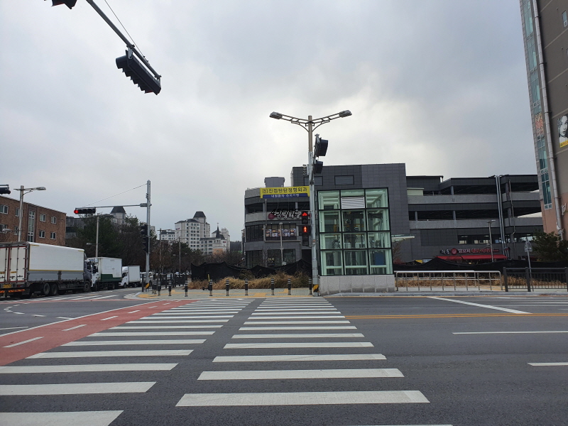 저 앞에 횡단보로 신호등 바로 오른쪽으로 보이는 투명한 건물이 진접역 엘리베이터 같았다. 그 뒤쪽으로는 나대지인데, 진접역이 개통하고 유동인가 늘면 그 자리에도 상가건물이 들어올 것 같다. 단우타워는 그 오른쪽에 있다.