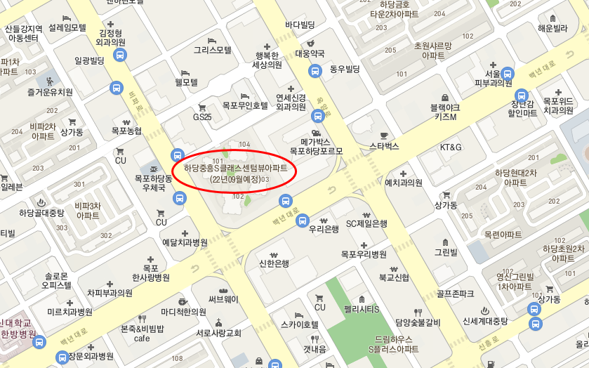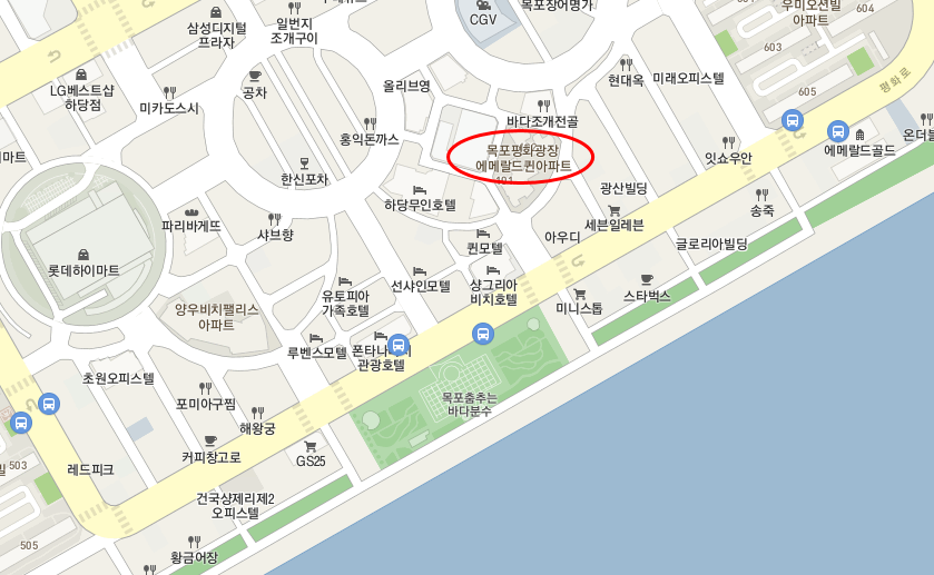 하당신도시에는 최고가 아파트 10개 중 3개의 아파트가 있다. 위 지도 가운데 부분에 '포르모' 옆으로 1위인 하당지구중흥S클래스센텀뷰를 짓고 있다. 지도 아래쪽으로 보이는 목포평화광장에메랄드퀸는 5위인데 거리가 있어서 따로 가지 않았다. 그 아래로 보이는 스타벅스 아래쪽으로 평화광장이 있다. 7위 옥암영신펠리시아는 지도 위쪽 이마트 바로 옆에 있다. 지도상 따로 나오지 않고 근처에 제일풍경채 아파트 등 여러 아파트가 있다.