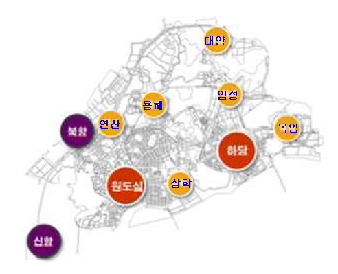 위 그림은 2030 목포 도시기본계획에 나온 도시공간구조이다. 2도심-6지역중심-2특화핵 체제로 원도심과 하당이 도심, 북항과 신항이 특화핵, 노란색으로 표시된 곳들이 지역중심이다.