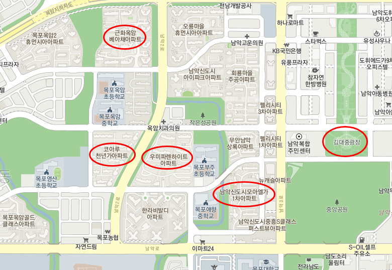 KTX 목포역이 있는 원도심은 구도심으로 관광지가 몰려 있고 아파트보다는 노후된 주택들이 밀집해 있다. 또 다른 도심인 하당에는 10개 중 3개의 아파트가 속해 있었다. 하당에는 목포에서 학원가들이 가장 많은 곳이기도 했다. 무안과 함께 남악신도시를 구성하는 옥암에도 4개의 아파트가 있었다. 그리고 북항과 연산에 각각 1개씩 있었다. 나머지 하나는 석현동에 있어서 어느 지역중심에 가까운지 정하기가 어려웠는데, 석현은 과거에 지역중심이었고 2030 도시기본계획에서는 임성이 새로운 지역중심이 됐다. 이중 옥암, 하당, 북항에 다녀왔다.