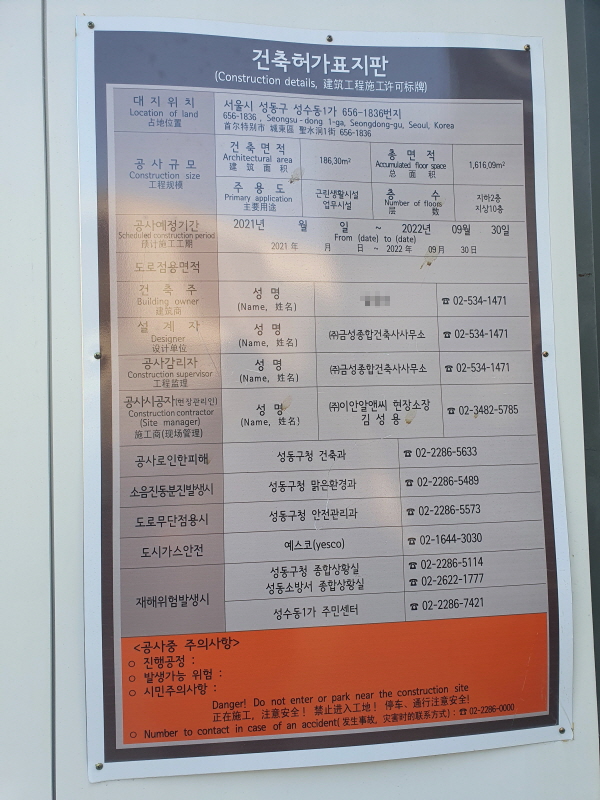 서울숲IT캐슬에서 성수더스페이스타워로 가는 길에도 공사현장이 있었다. 주용도가 근린생활시설, 업무시설로 적혀 있었는데, 여기도 또 다른 지식산업센터가 생기는 것일까.