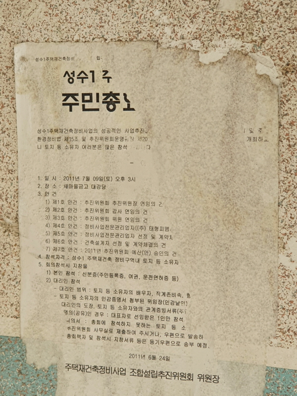 성수1구역 내에 있는 어느 빌라에서 재건축 관련 안내문을 찾았다. 그런데 날짜가 무려 10년 전이었다.