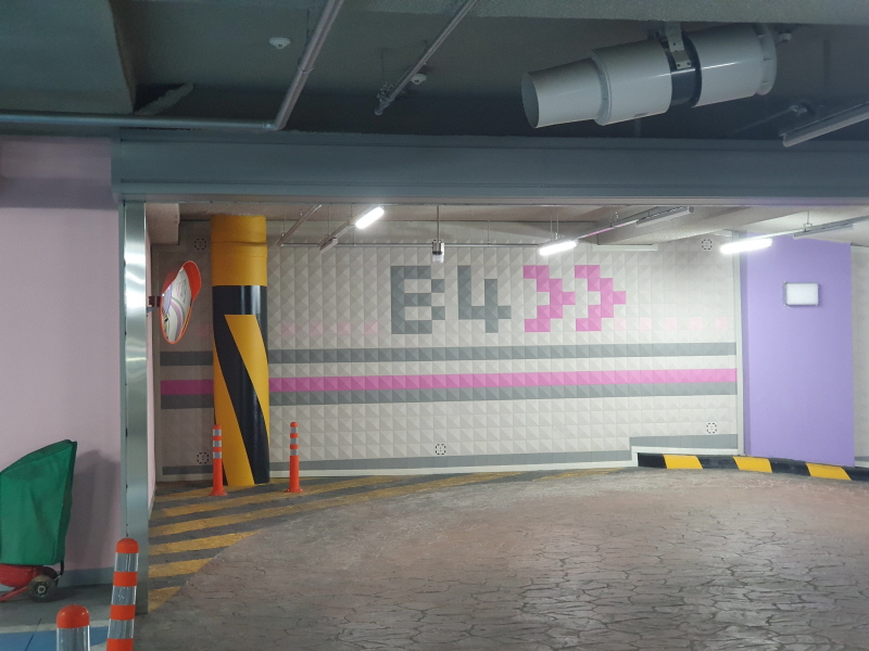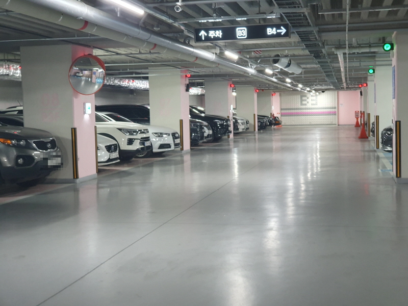 2020년 준공이라 주차장도 최신식이었다. 왼쪽 사진을 보면 기둥 위쪽에 빨간색과 녹색이 보이는데, 주차공간에 센서가 있어서 빈공간을 알려주는 것이다.