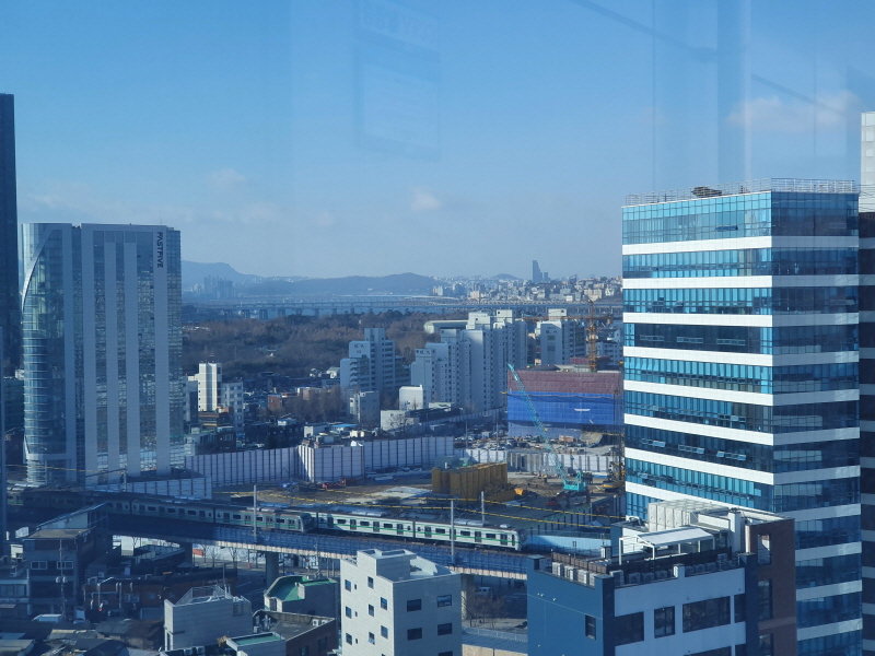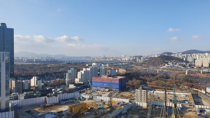 저 멀리 한강이 살짝 보였다. 앞서 서울숲IT캐슬에서 언급한다는 것을 깜빡했는데, 서울숲IT캐슬은 지하철이 다니는 길 바로 옆에 있다. 위 사진에도 아래쪽을 보면 2호선 지하철이 두 대 지나가고 있다. 서울숲IT캐슬 저층은 이런 소음에 조금 영향을 받을 것 같았다.