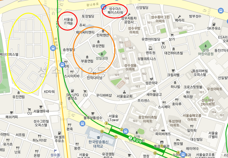 뚝섬역에서 출발해서 서울숲IT캐슬, 성수더스페이스타워를 봤다. 그리고 뚝섬역으로 돌아오면서 성수1구역에 있는 민락맨션, 유성연립, 부용빌라, 부용연립을 살펴봤다. 성수동 지식산업센터 옥상에서는 서울숲아이파크리버포레 1차와2차 공사현장도 보였다. 위 지도에서 각각 빨간색, 주황색, 노란색으로 표시했다.