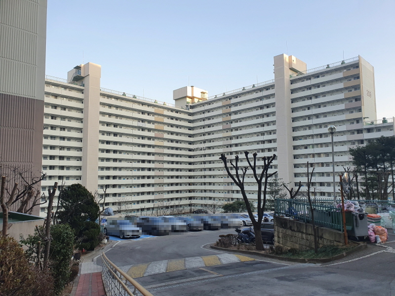 경매로 나온 물건이 있는 208동이다. 건물 모양이 독특하다. 1호와 2호, 3호와 4호, 5호와6호가 조금씩 엇갈린 계단식 구조다.