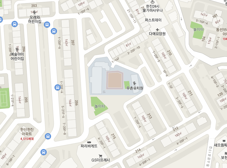 단지 내에도 마을버스 정류장들이 많이 보인다. 특이한 점은 210동부터 215동이 있는 곳에는 마을버스 정류장이 없다는 것이다. 그쪽에 사는 주민들은 도보로 성신여대입구역까지 가거나 단지 바깥에서 성북22번을 탈 것 같다.