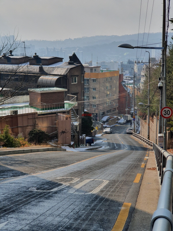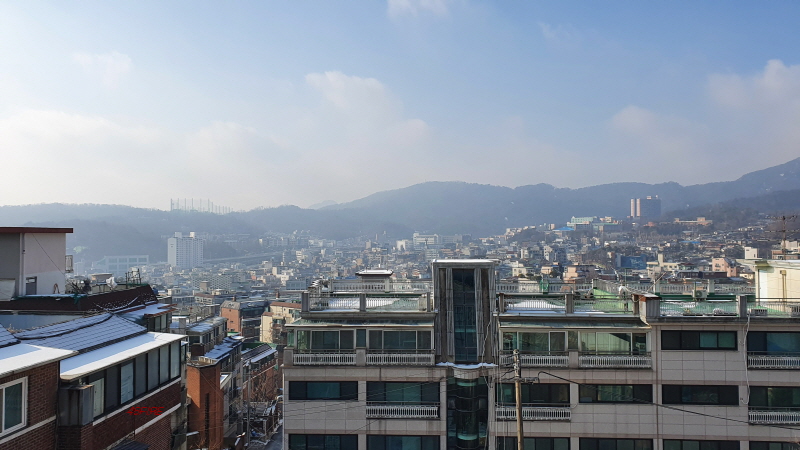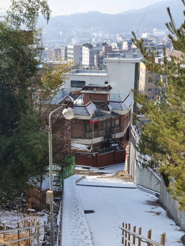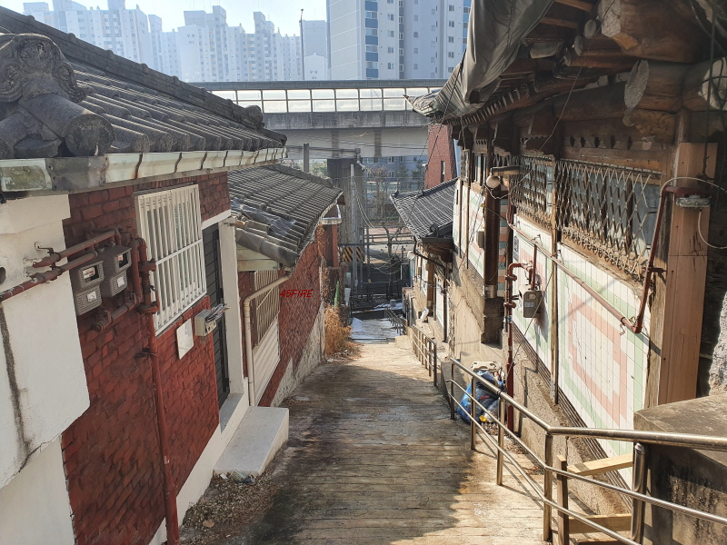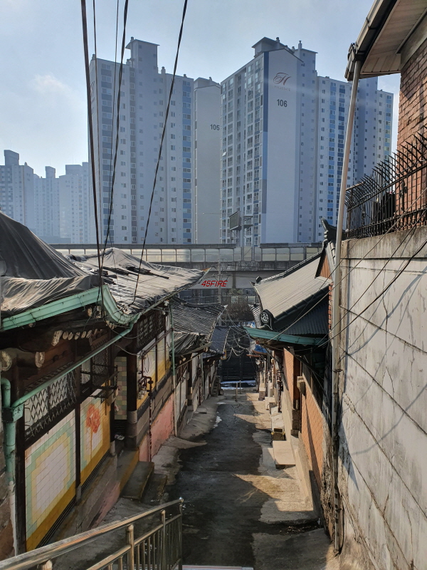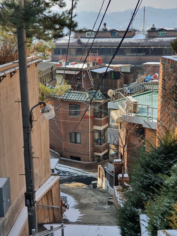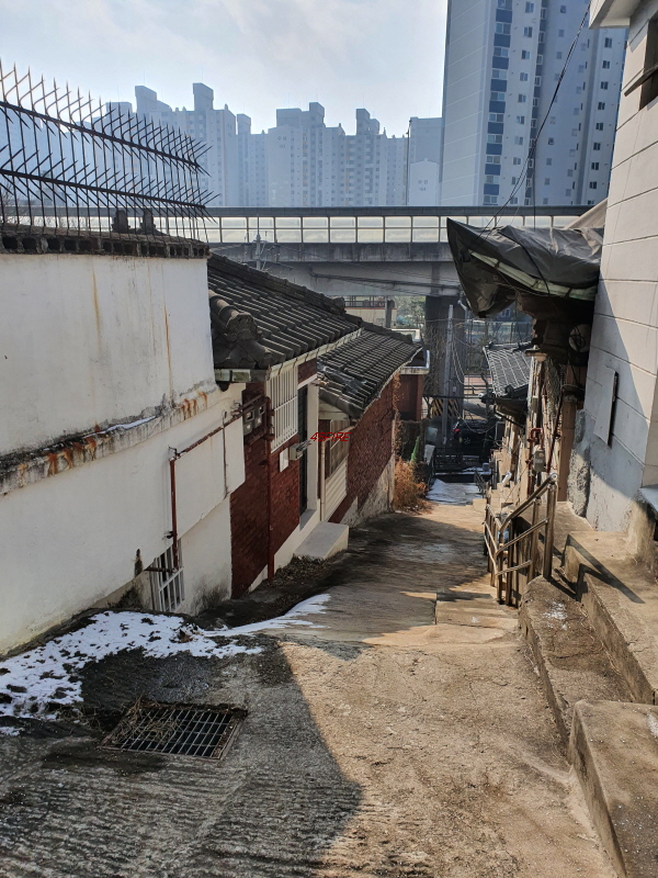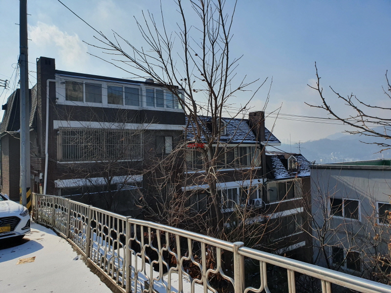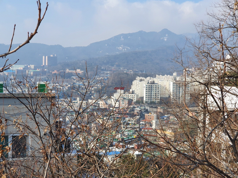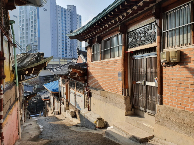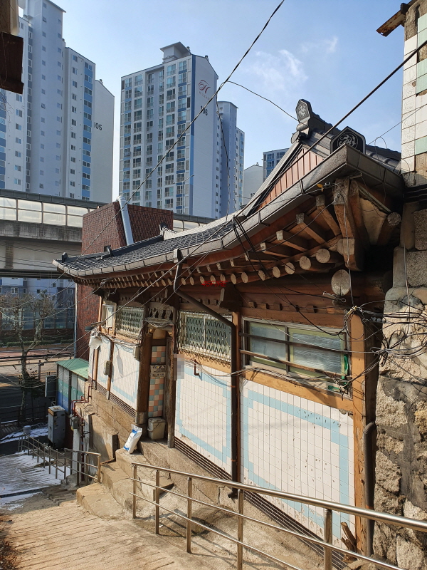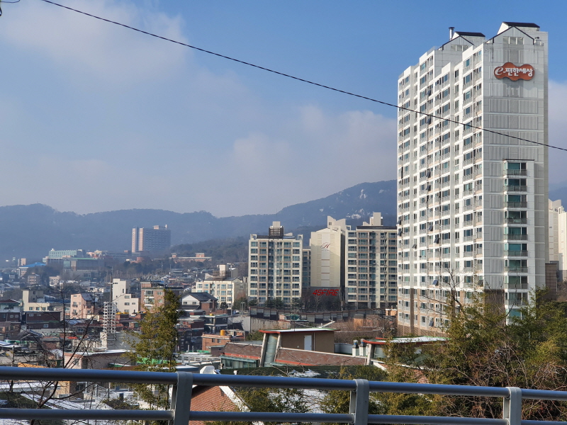 경사를 따라 한옥들이 몇 채 있었다. 내부순환로 건너편으로는 정릉힐스테이트 1단지 아파트가 보였다.