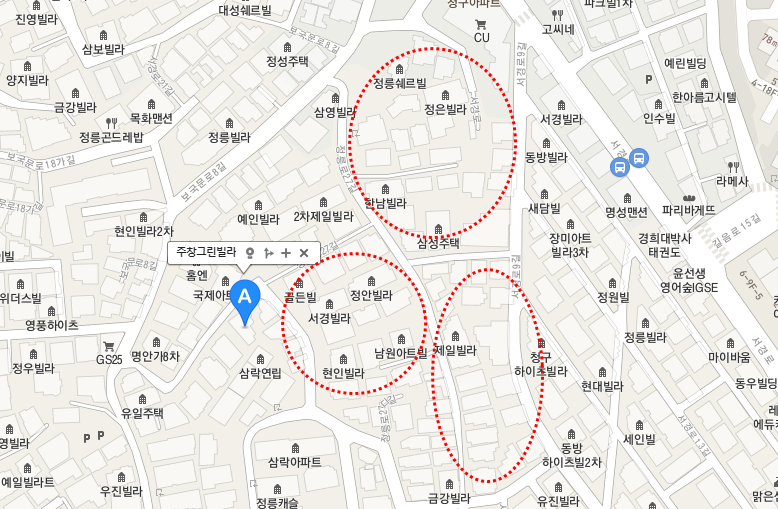 경매 물건이 나온 주창그린빌라 오른쪽으로 가로주택정비사업을 추진하는 구역들이 있다. 가장 오른쪽의 긴 타원형으로 표시한 부분이 정릉동 218-1번지 일대 가로주택정비사업이다. 그 위쪽도 가칭 2단지로 가로주택정비사업을 추진하고 있다. 가운데 원으로 표시한 부분도 어떤 글에서는 가로주택정비사업을 추진한다고 봤는데 확실하지 않다.