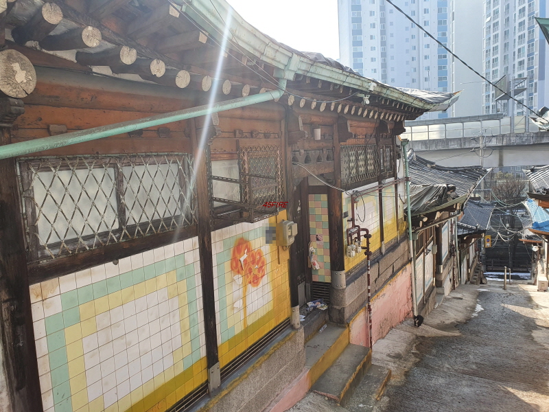 경사가 있다고 해도 잘 유지 및 보존을 했으면 좋았을 것 같다. 한옥 벽면에도 화장실에서나 볼 수 있는 듯한 타일들이 붙어 있었다. 이쪽의 한옥들은 1967년 무렵 지은 것들이다.
