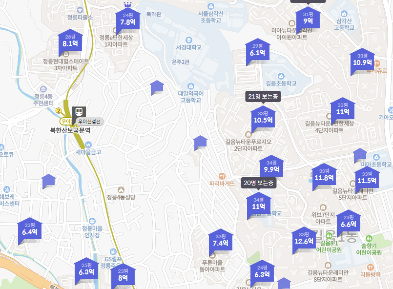 정릉e편한세상1차 아파트 24평이 7.8억, 정릉현대힐스테이트3차 아파트 26평이 8.1억이다. 그리고 길음뉴타운의 33~34평 아파트들은 10억이 넘는다.