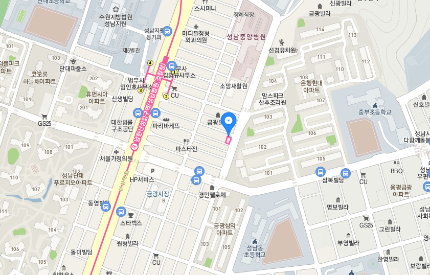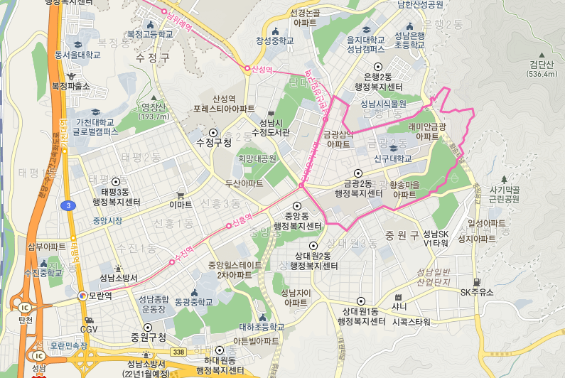 은행동 아래쪽으로 금광동이 있다. 가칭 은행1구역 재개발은 금광2동과 함께 추진하는 거 같았다. 또한 남한산성입구역 근처에는 가로주택정비사업을 추진하는 곳도 있었다. 금광동 아래쪽으로는 상대원동이 있다. 앞에서는 서울로 가는 시간만 고려했는데, 남한산성입구역에서 판교역까지는 40분 가량 소요된다. 10개역 거리이지만 수인분당선, 신분당선으로 환승을 해야 하므로 그 시간도 고려해야 한다.
