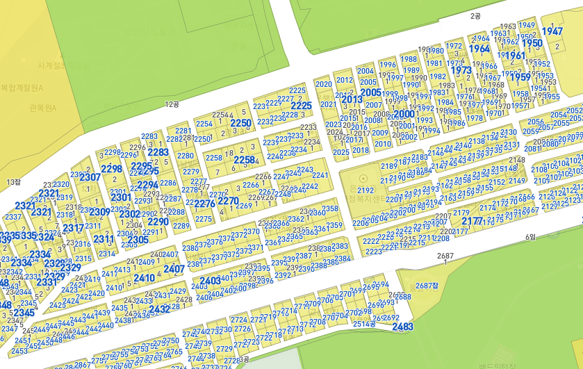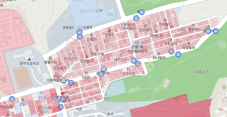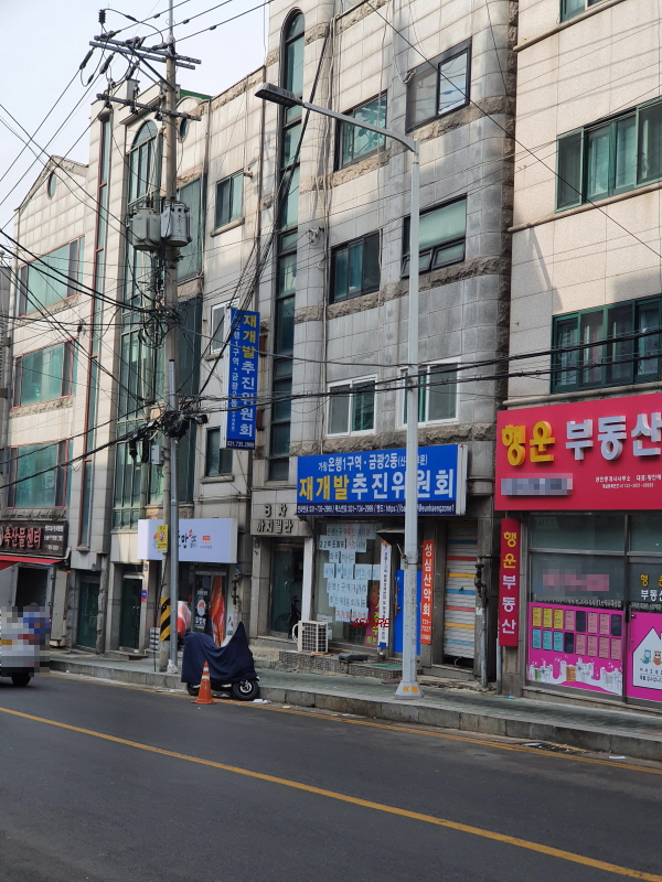 노후도는 충족한다. 몇몇 신축을 제외하고 전체적으로 붉다. 대부분 1990년대 초반에 지어졌다. 가운데에 버스가 다니는 길을 기준으로 위쪽은 은행1동, 아래쪽은 금광2동이다. 은행1동만 재개발을 하는 것보다 아래쪽의 금광2동의 일부도 함께 재개발을 하면 좋을 것 같다고 생각했는데, 마침 추진위원회 사무실에도 금광2동이 적혀 있었다. 부재중이라 자세한 사항은 확인하지 못했다.