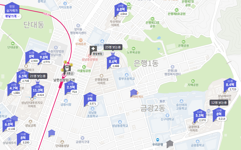 입지는 좋아 보인다. 바로 옆에 위례신도시도 있고, 지하철 8호선도 지나간다. 남한산성입구역부터 잠실역까지는 9개역이고 18분이 소요된다. 은행동은 아래쪽의 은행1동과 위쪽의 은행2동으로 나누어지는데, 이번 임장에서는 은행1동만 다녀왔다.