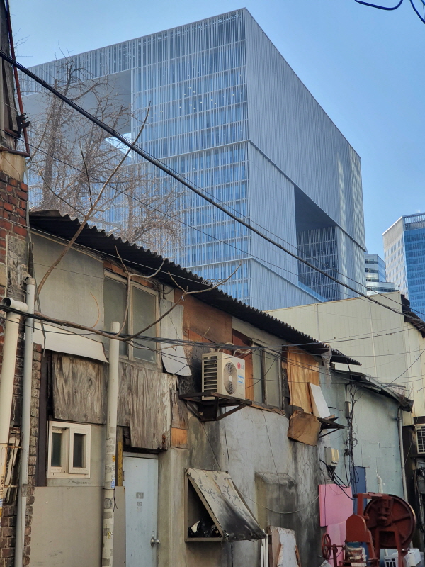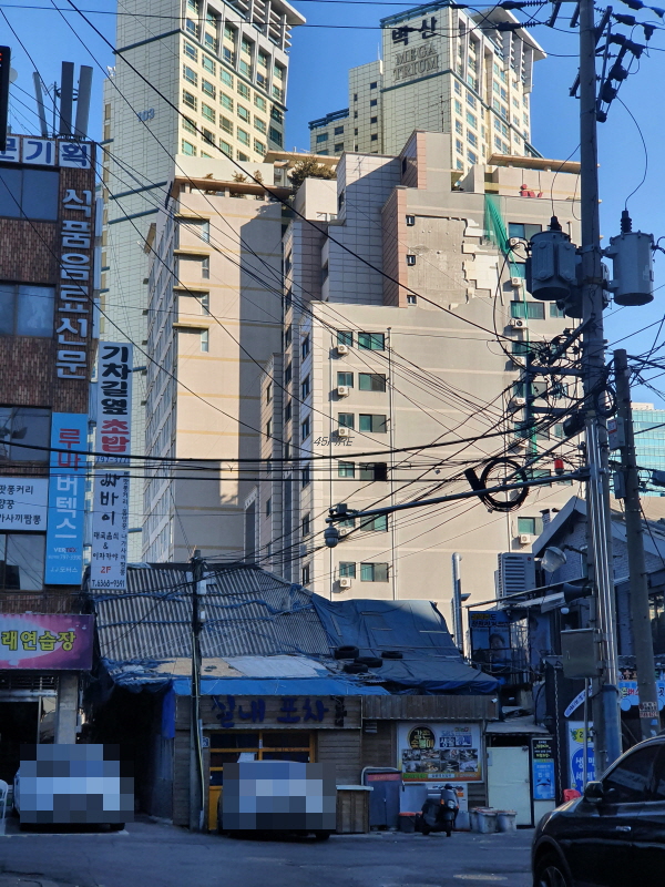 건물 전면부는 그래도 괜찮았는데 뒤쪽은 완전 다른 모습이었다. 건물 뒤쪽으로 아모레퍼시픽 건물이 보인다. 신용산역에서 상징적인 건물이 됐다.