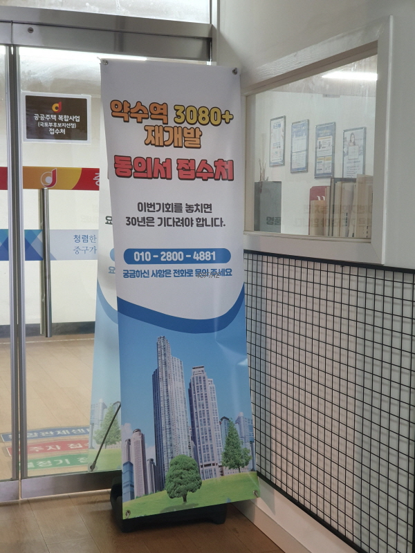 약수역 3080+ 재개발 동의서 접수처도 보였다.