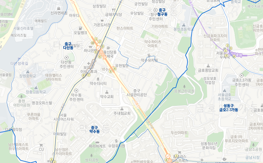 약수역 주변을 행정경계로 보면 약수동, 청구동, 다산동으로 나누어 진다. 도심 공공주택 복합사업 6차 후보지로 선정된 '약수역 인근'은 약수동에 포함된다. 약수역 4번 출구부터 응봉근린공원까지가 대략적인 위치이다. 행정경계를 보고 '약수역 인근'과 약수하이츠 아파트가 나누어진 이유를 확실히 알 수 있었다. 임장을 가기 전에 지도를 봤을 때 왜 저기까지만 아파트가 있을까 하는 생각이 들었는데 아파트가 있는 곳은 청구동, 약수역 인근은 약수동이었다.