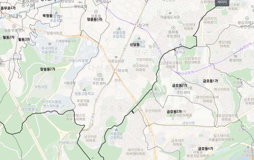 약수역 인근의 지번 주소가 '신당동'이다. 법정경계를 살펴보니 신당동은 버티고개역, 약수역, 청구역, 신당역 주변 일부까지 포함하는 넓은 지역이었다.