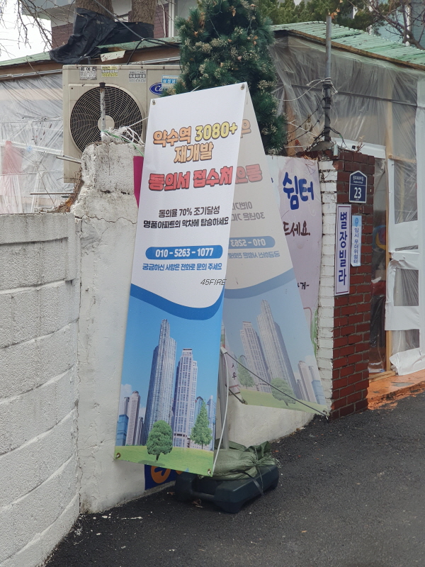 다른 지역과 달리 약수역 인근에서는 재개발에 반대하는 현수막이 거의 안 보였다.