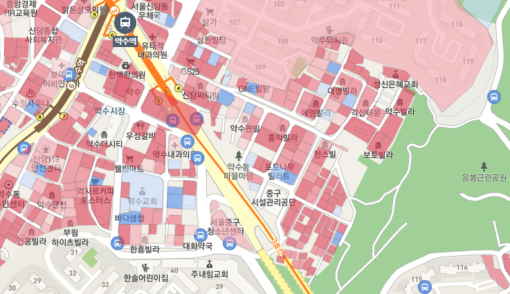이쪽은 경사도 심하고 구축 건물이 많은데, 저 아래쪽은 평지에 약수역에서도 매우 가까워서 상업용 건물들이 많았다.