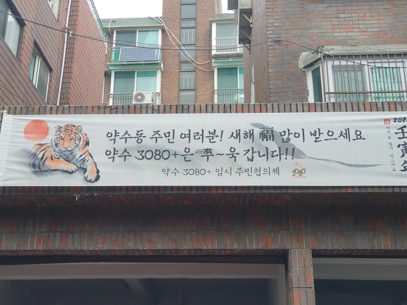 이런 현수막을 보면 약수 3080+에 대한 주민들의 동의율이 높을 것 같다.