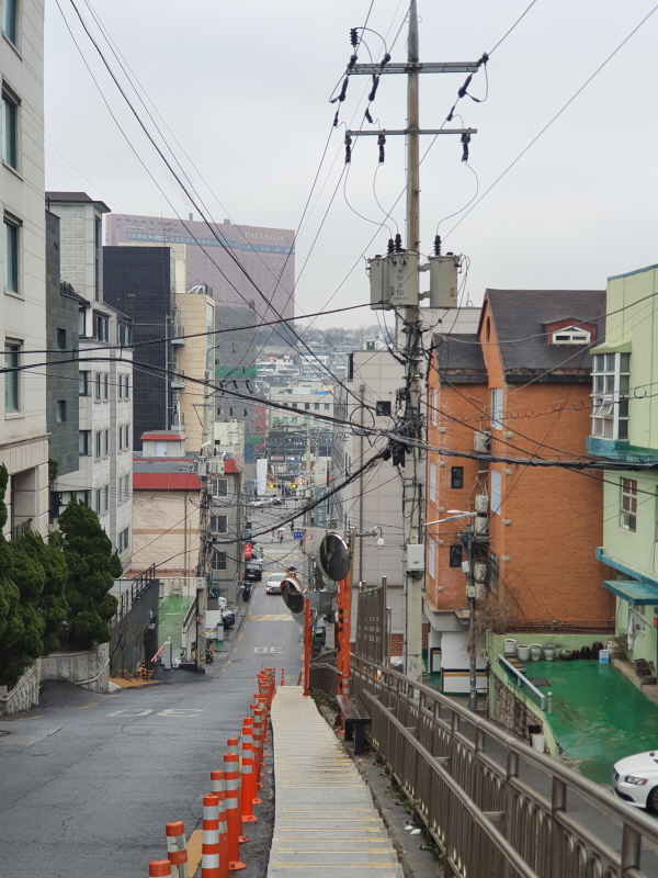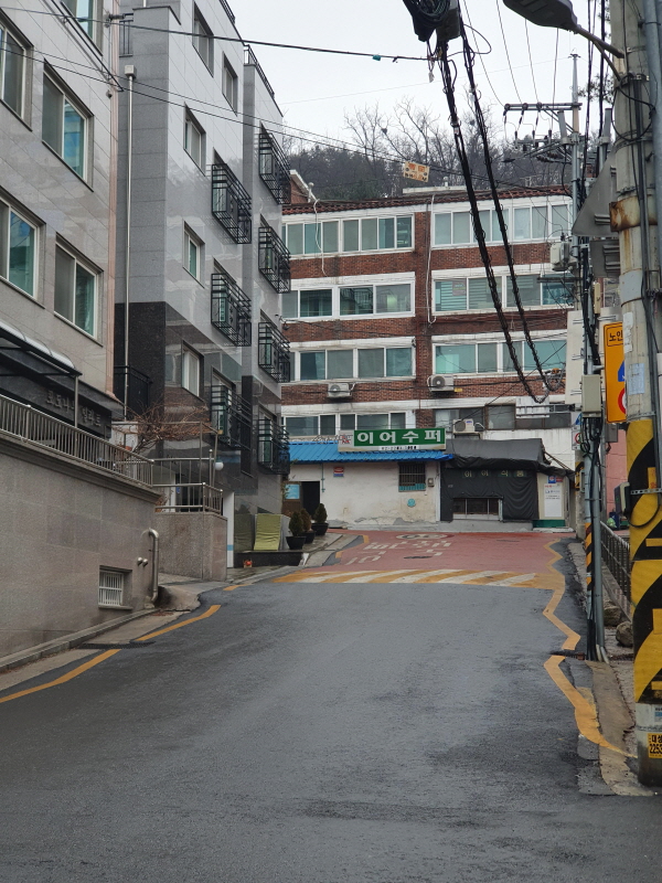 약수역 4번 출구 근처에서 '약수역 인근' 중심으로 가는 길이다. 경사가 상당했다. 사진상 잘 안 보이지만 이 도로가 두 갈래로 갈라진다. 아래쪽으로 가는 길과 위쪽으로 가는 길로 나누어지는데 두 도로 사이의 격차도 상당했다.