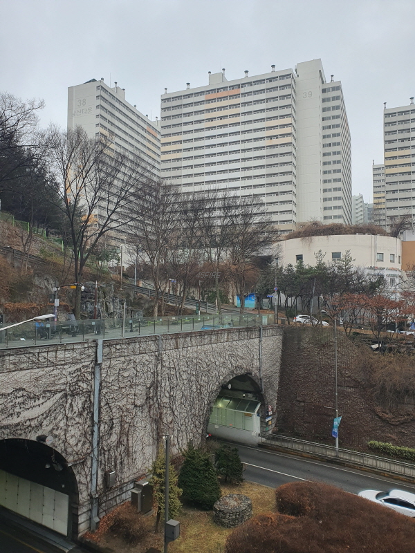 왼쪽으로 남산타운아파트가, 오른쪽으로 신라호텔이 보인다.