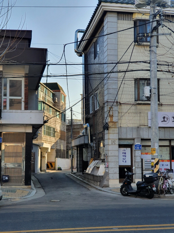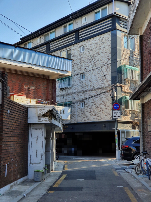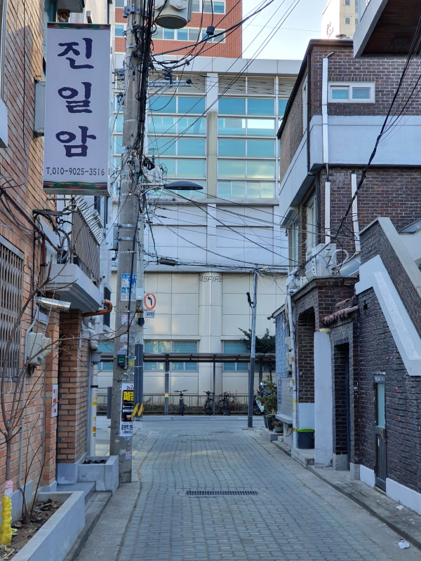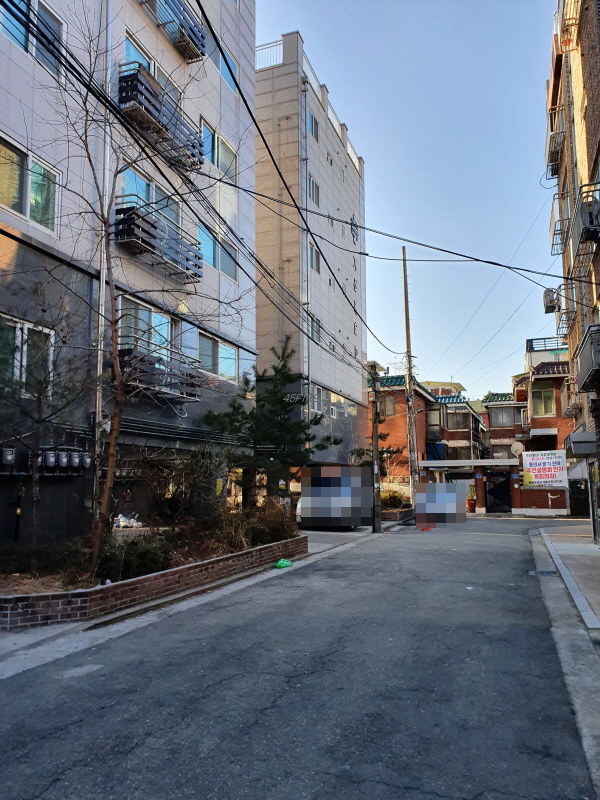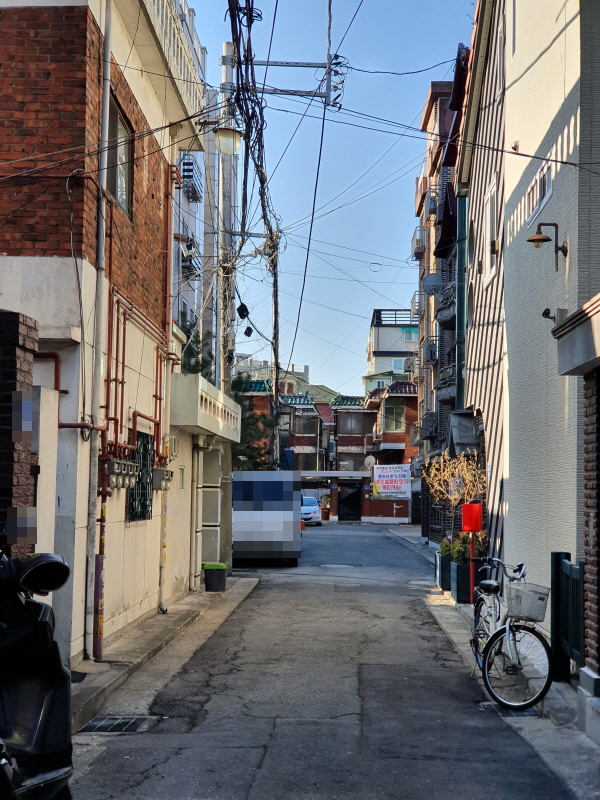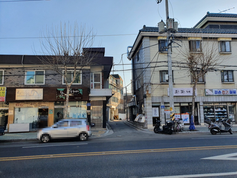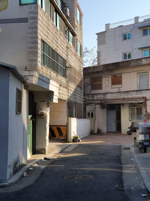 골목 안쪽으로 들어와서 본 모습인데, 건물 뒤쪽은 4차선 도로에 접할 것이다.