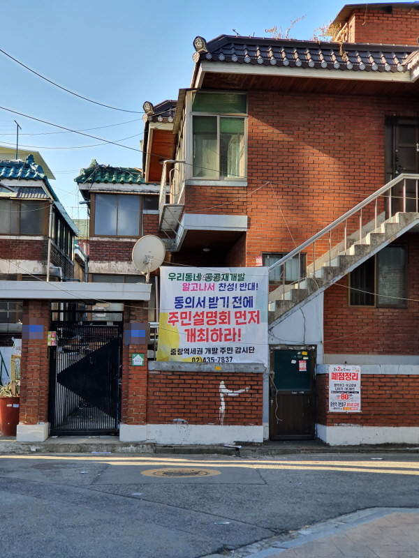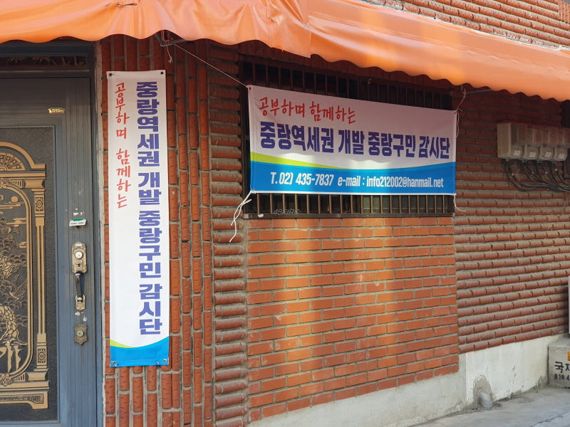 아까는 추진위원회 현수막이 있었는데, 여기는 중랑역세권 개발 주민 감시단 현수막이 있다.