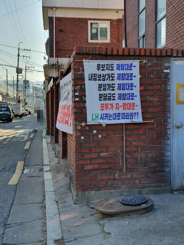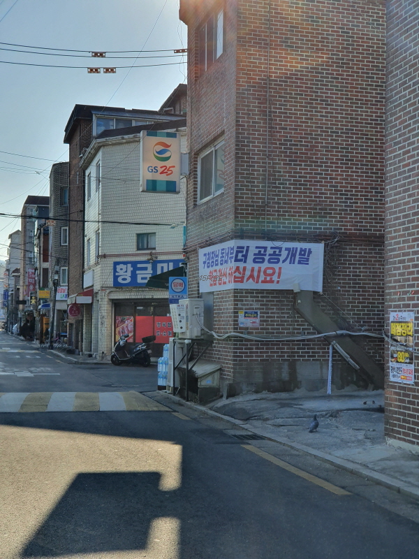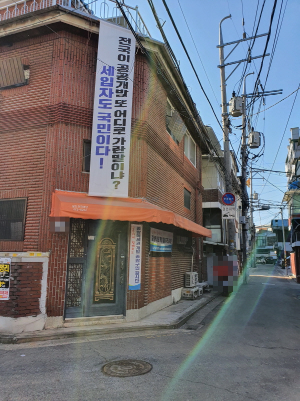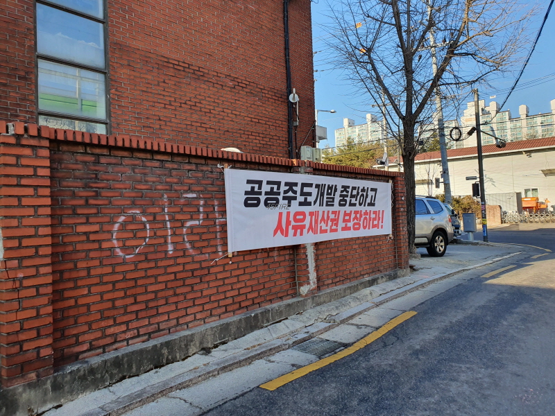 앞으로 보이는 단독주택 벽면에 붙은 작은 현수막에 공공재개발에 반대하는 내용이었다.