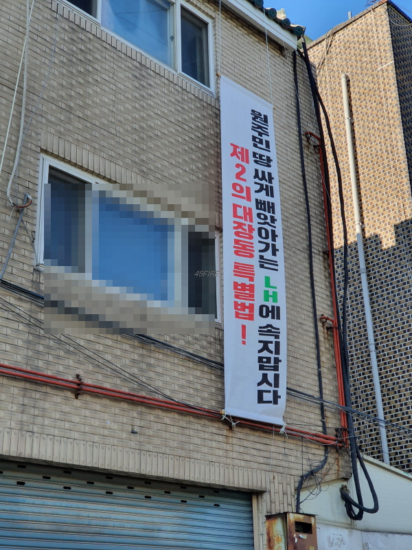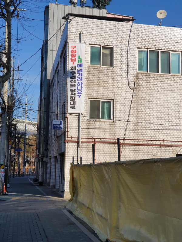 여기도 공공개발, 현금청산 등에 반대하는 현수막이 보였다.