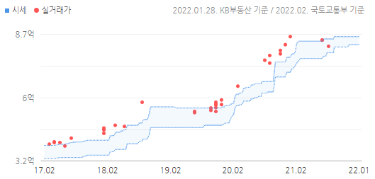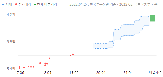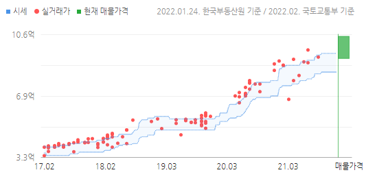 시세 변화가 놀랍다. 2017년 2월에 3.65~4.05억에 거래됐는데, 2021년 10월에는 9.28억에 거래됐다. 현재 매물은 9.2억부터 10억까지 올라와 있었다.