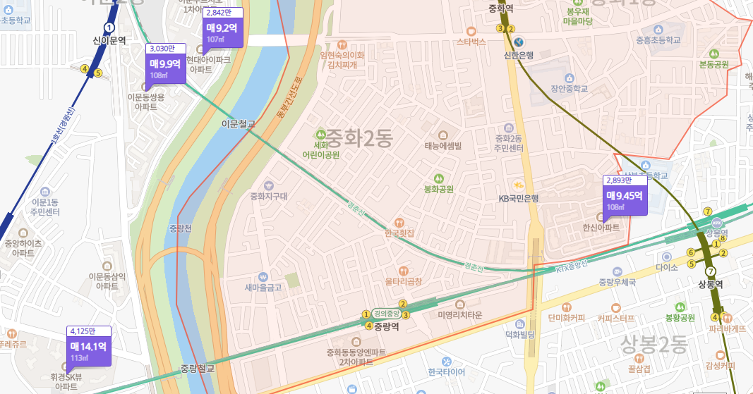 카카오맵에서 주변의 지하철역들이 보이게 표시했다. 중랑역 인근으로 중랑역에서 가장 가깝지만 중랑역은 경의중앙선과 경춘선이 지나가서 배차간격이 길고 시내쪽으로는 청량리역까지만 가는 한계가 있다. 그래도 입지는 괜찮다고 생각한다. 도보로 중랑천을 건널 수 있는 다리만 생긴다면 신이문역까지 10~15분이면 갈 수 있다.