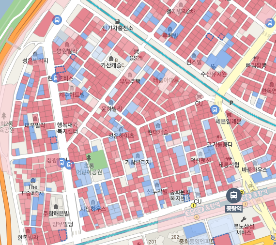 국토교통부 보도자료에 따르면 중랑역 인근의 노후도는 87%였다. 위 그림에서도 몇몇 신축들이 보이긴 하지만 전체적으로 노후된 모습이다. '중랑역 인근'과 중랑역 사이의 이번에 구역으로 지정되지 않은 곳은 상대적으로 신축들이 많아 보인다. 그래도 신축보다 노후된 주택들이 많아 보인다. 이번에 같이 구역으로 지정됐으면 더 좋았을 것 같다.