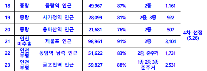 중랑구에서 '중랑역 인근' 외에 사가정역 인근, 용마산역 인근도 4차 후보지로 선정됐다. 참고로 위의 표는 '역세권'만 표시한 것이다. 면적, 노후도, 종, 세대수 순으로 중랑역 인근에는 1,161세대가 공급될 예정이다. 중랑구에서 저층주거지로 용마터널 인근, 상봉터미널 인근도 4차 후보지로 선정됐다.