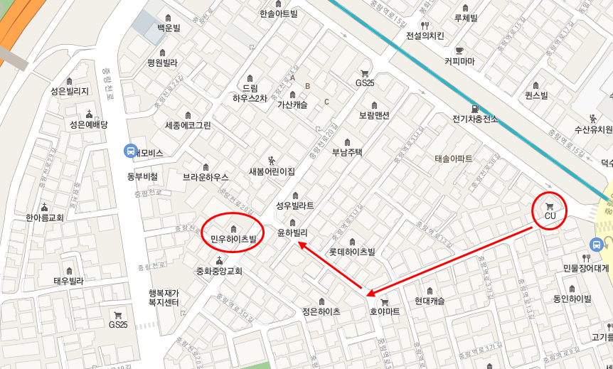 정확한 위치는 모르겠지만, CU편의점에서 도로를 따라 내려오면서 사진을 찍었다.