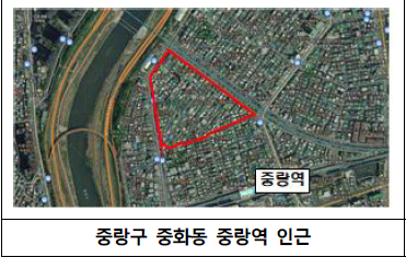 재개발 명칭은 '중랑역 역세권'이지만 중랑역 조금 떨어진 곳만 지정됐다. 구역으로 지정된 곳과 중랑역 사이에 있는 주택들의 노후도도 '중랑역 역세권'과 큰 차이가 없었는데 왜 이렇게 구역이 설정됐는지 모르겠다. 다른 행정구역에 속해 있는 것도 아니고 모두 중화동이었다.