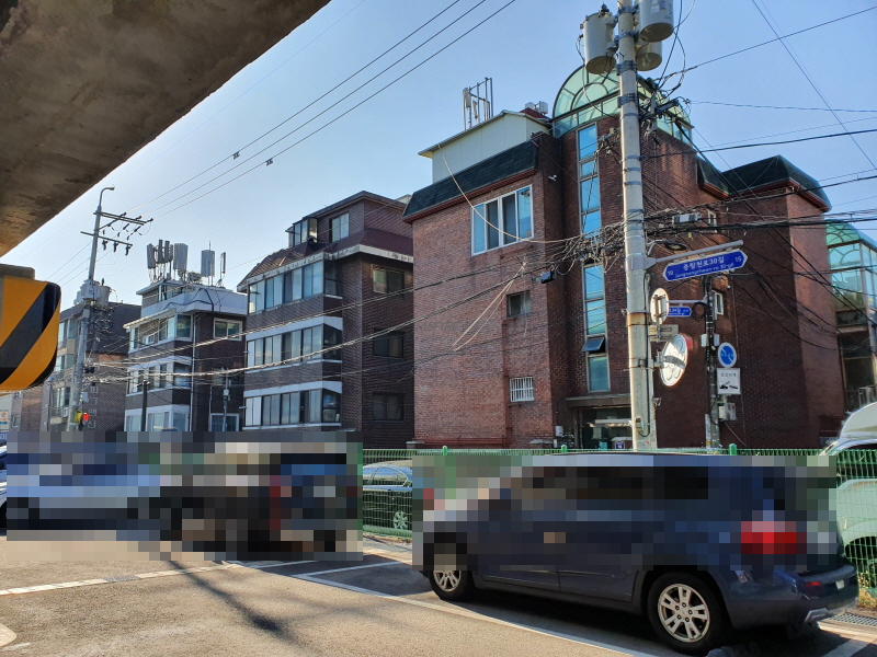 저 뒤쪽으로 보이는 건물이 중랑역이다. 2번 출구를 의미하는 숫자 2도 보인다. 이 정도면 중랑역 초역세권이다.