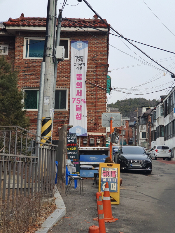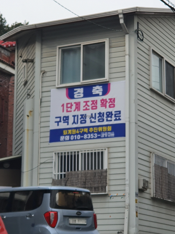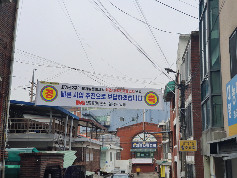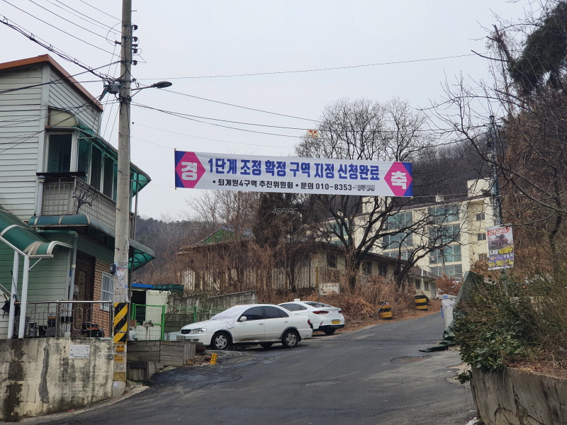사업시행자 지정고시 완료를 축하하는 현수막이 보였다.